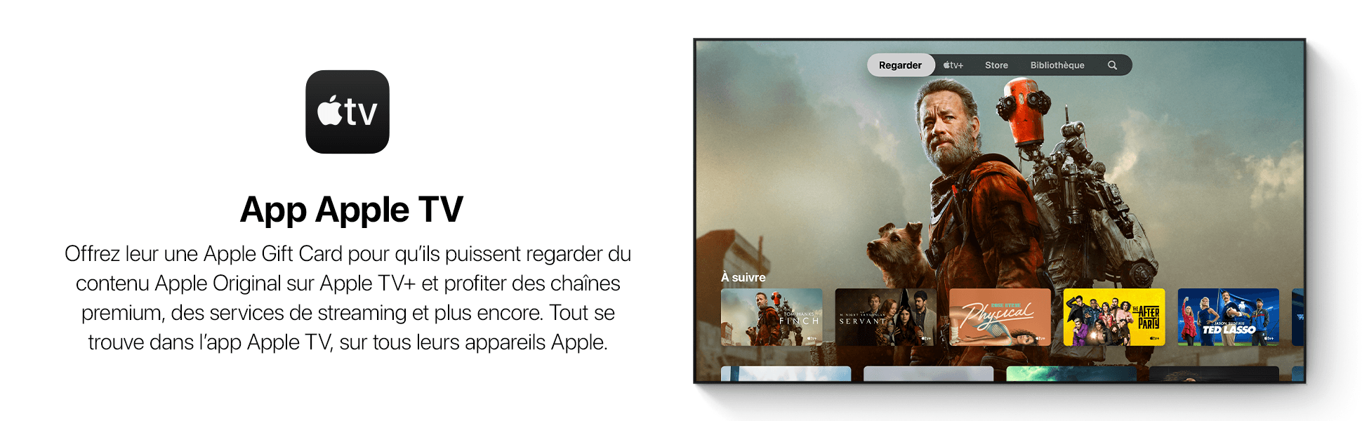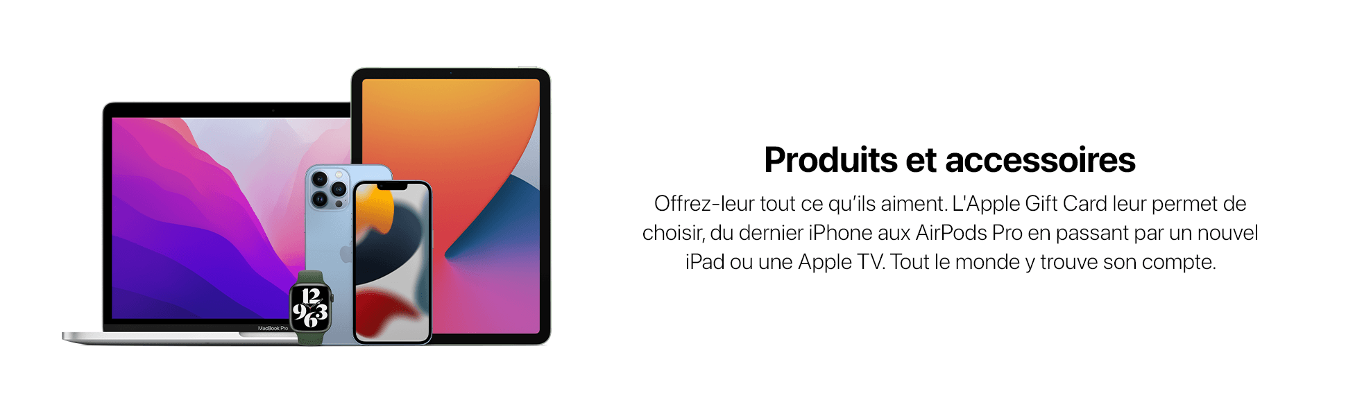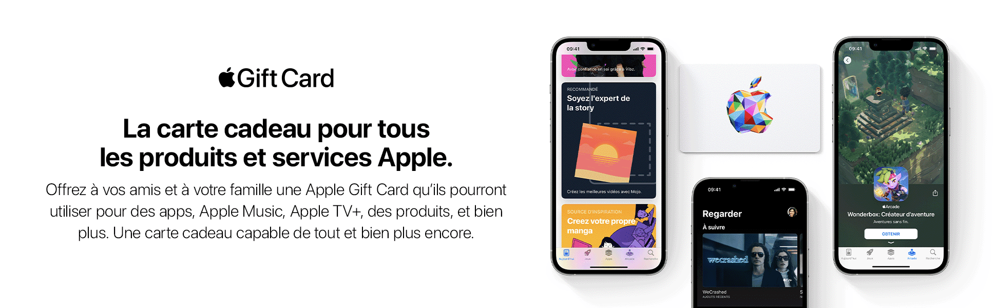 L'Apple Gift Card est la nouvelle carte cadeau App Store et iTunes. Vous pouvez utiliser la carte cadeau pour recharger le solde de votre compte Apple, ce qui vous permet d'acheter tout ce que vous désirez sur l'App Store, iTunes, apple.com et bien plus. Encore mieux, vous pouvez utiliser une Carte cadeau Apple à l'Apple Store le plus proche de chez vous pour acheter le dernier iPhone ou tout autre appareil ou accessoire. Utilisable dans tous les Apple Store, sur l’App Store ou pour des abonnements pour de la musique, iCloud+, et bien plus.