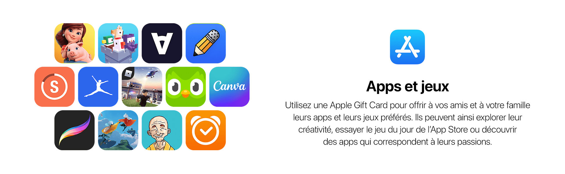Vous pouvez utiliser votre carte cadeau Apple de 25 EUR pour acheter des produits, des applications, des jeux, de la musique et bien plus encore sur l'App Store, l'iTunes Store, l'Apple Store en ligne ou en magasin en France.