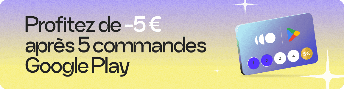 Effectuez 5 commandes de 10 € ou plus de cartes cadeaux Google Play, et vous débloquerez une remise de 5 €.