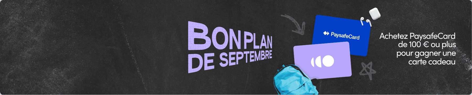 Conditions : Vous participerez automatiquement au concours lorsque vous achèterez une PaysafeCard de 100 € ou plus avant 23 h 59 le 30/09/2025. 5 gagnants seront sélectionnés au hasard et notifiés via leur adresse e-mail enregistrée avant le 10/10/2025. Cliquez ici pour consulter les conditions générales.