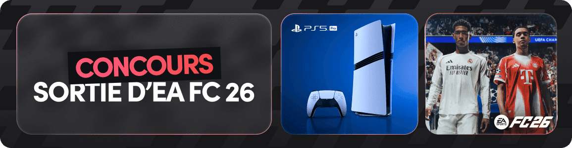 Conditions : Vous avez jusqu’au 30/09/2025 à 23 h 59 pour acheter une carte PlayStation d’une valeur supérieure ou égale à 50 € afin de participer au concours. Trois prix sont à gagner : 1 PS5 Pro et 2 jeux EAFC 26 (édition standard). Les gagnants seront informés via leur adresse e-mail enregistrée au plus tard le 10/10/2025. Cliquez ici pour consulter les conditions générales.